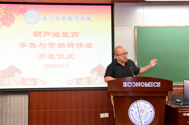 在开班仪式上,廖景峰主任首先代表厦门大学经济学院热烈欢迎六合联盟医药零售与营销研修班的学员到厦大学习,并就厦门大学及经济学院的相关情况进行了介绍。他说,六合联盟学员走进厦大就是厦大的校友,希望未来的日子能够关心、支持母校的发展,多提宝贵意见,同时他也祝大家在厦大学习期间学有所成、学有所获。